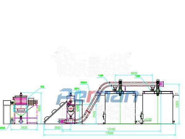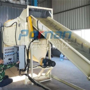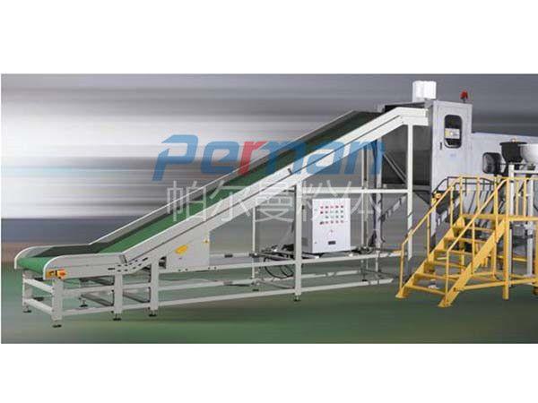 生產原材料會在皮帶輸送的作用進行進入到無塵拆包機中進行拆包作業,分離出的散料會在出料口直接進入到管鏈輸送機設備入料口中進行傳輸作業。