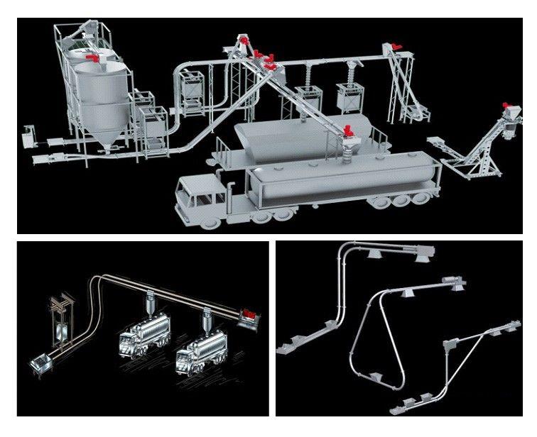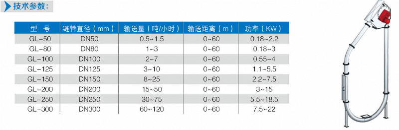 在密閉管道內,以鏈片為傳動構件帶動物料沿管道運動。當水平輸送時,物料顆粒受到鏈片在運動方向的推力,就隨鏈片向前運動,形成穩定的料流;當垂直輸送時,管內物料顆粒受鏈片連續向上的推力,阻止了物料下滑,并產生了橫向側壓力,增強了物料的內摩擦力,當物料間的內摩擦力大于物料與管內壁外摩擦力及物料自重時,物料就隨鏈片向上移動,形成連續料流。粉體物料可在三維空間內沿封閉管道直線移動或改變方向;水平輸送距離可達60米,垂直輸送距離可達到30米。