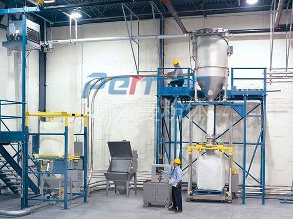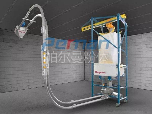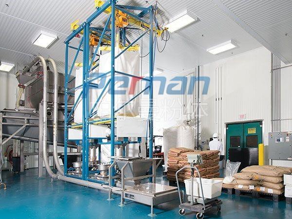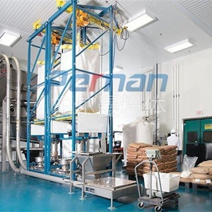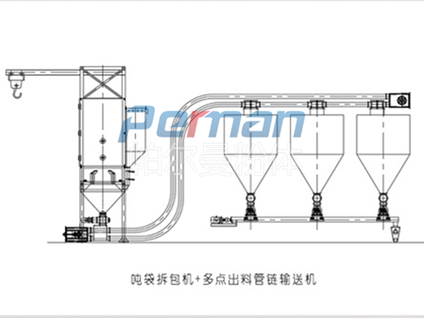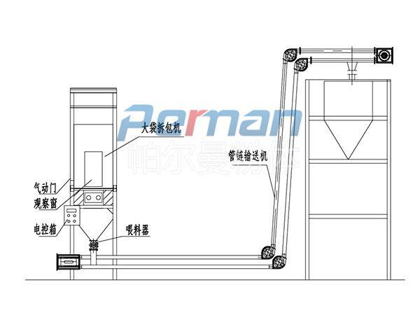 生產原材料會在皮帶輸送的作用進行進入到無塵拆包機中進行拆包作業,分離出的散料會在出料口直接進入到管鏈輸送機設備入料口中進行傳輸作業。